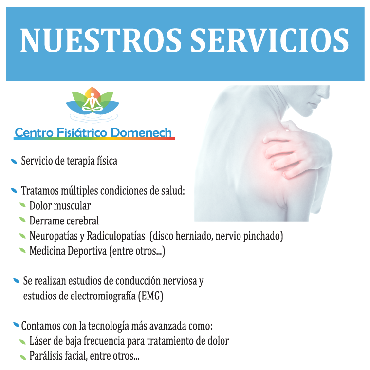 Servicio de terapia físicaTratamos múltiples condiciones de salud:Derrame cerebralNeuropatías y Radiculopatías (disco herniado, nervio pinchado)Medicina Deportiva (entre otros..)Se realizan estudios de conducción nerviosa y estudios de electromiografía (EMG)Contamos con la tecnología más avanzada como:Láser de baja frecuencia para tratamiento de dolorParálisis facial, entre otros.