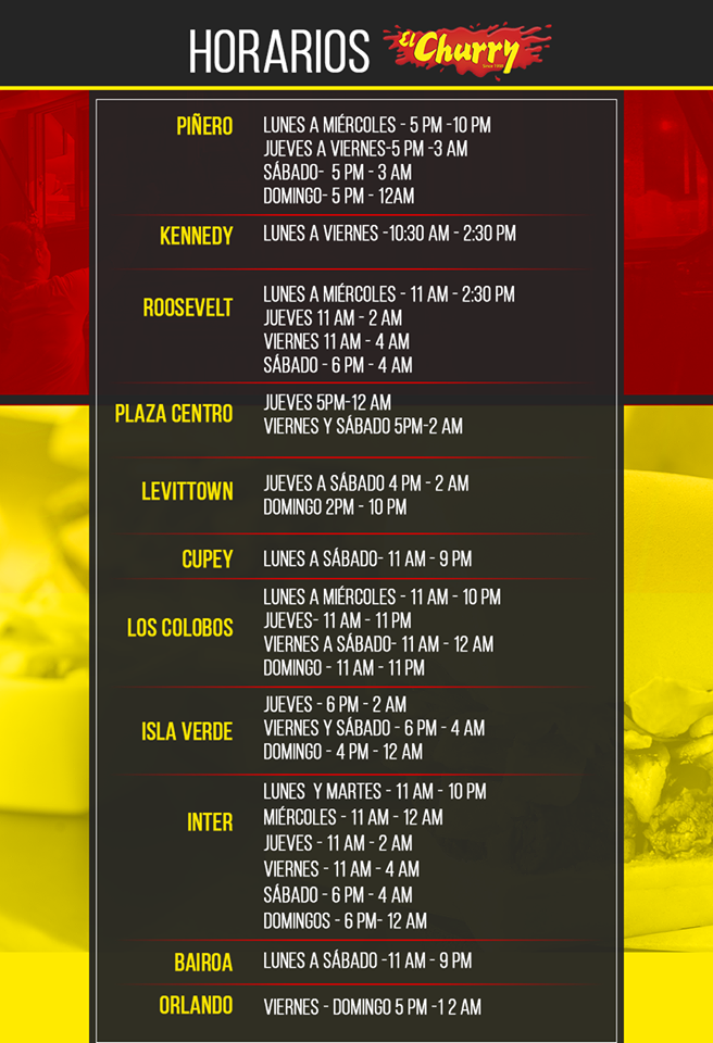 20 años de éxito más tarde, El Churry cuenta con diez localizaciones estratégicamente ubicadas en Caguas, Inter, Isla Verde, Roosevelt, Levittown, Ave. Kennedy, Los Colobos, Orlando FL. y dos restaurantes “freestanding”, uno en la Avenida San Claudio en Cupey y otro en la Ave. Bairoa, Caguas. Los restaurantes operan en horario diurno hasta las 9pm; y han incorporado platos criollos para más variedad que no deja de sorprender a sus clientes por su sabor único y calidad de servicio.