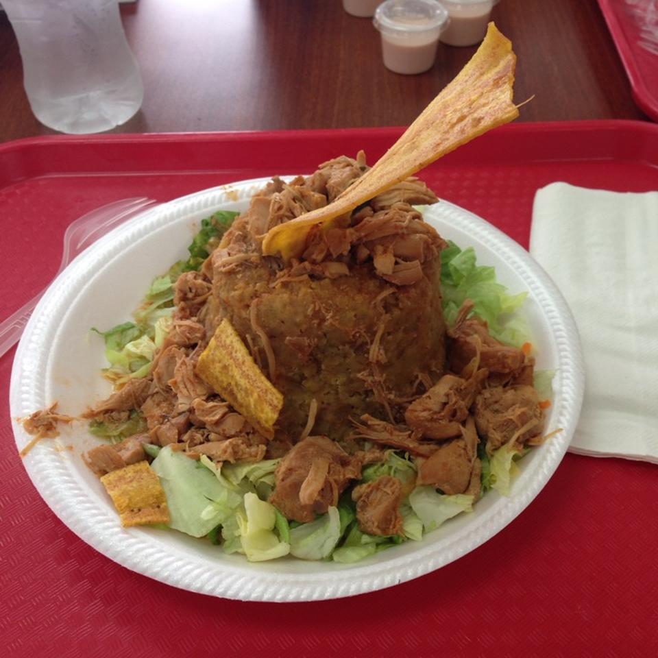Arroz Blanco o Arroz Guisado y Habichuelas, Mofongo de Platano, de Amarrillos o de Yuca Ensalada Verde o Tostones o Amarrillos