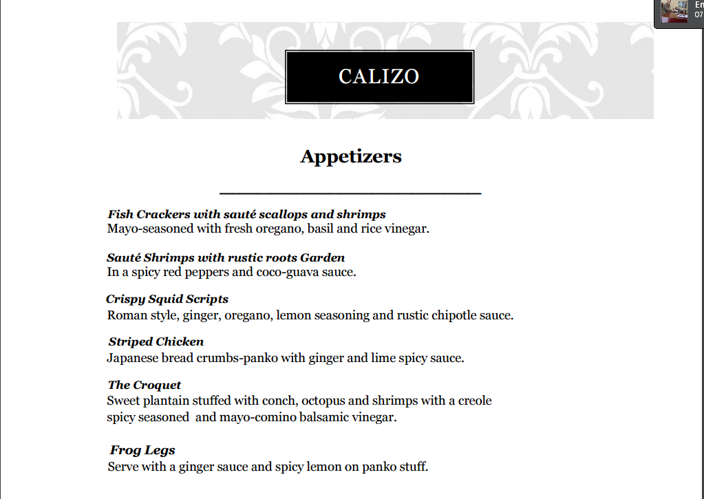 Calizo Restaurant en Fajardo, Puerto Rico cuenta con una decoración al estilo viejo san juan, con ladrillos en colores brillantes, mesas victorianas, decoraciones en madera y un toque playero con espacios al aire libre de Fajardo. Calizo también cuenta con salón VIP con aire acondicionado para todos los gustos. Chef Manolo usa su creatividad al integrar frutas en sus platos de mariscos y cortes de carnes de Puerto Rico, 12 salsas y adecuada seleccion de vinos y un servicio basado en Calidad y Atención al cliente a otro nivel. En Calizo Restaurant estamos enfocados en Mantener los Mejores estándares de Servicio.