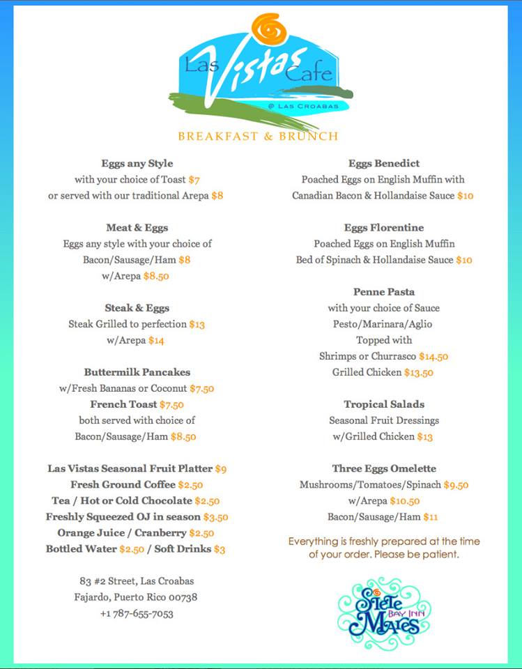 Las Vistas Café es un restaurante con vista panorámica de la playa Seven Seas, las Islas Municipio; VIeques y Culebra, El faro de Fajardo y la Bahía bioluminiscente. Horario: 8:00 am a 2:00 pmForma parte de Siete Mares Bay Inn en Las Croabas.Para ver nuestro menú visite
