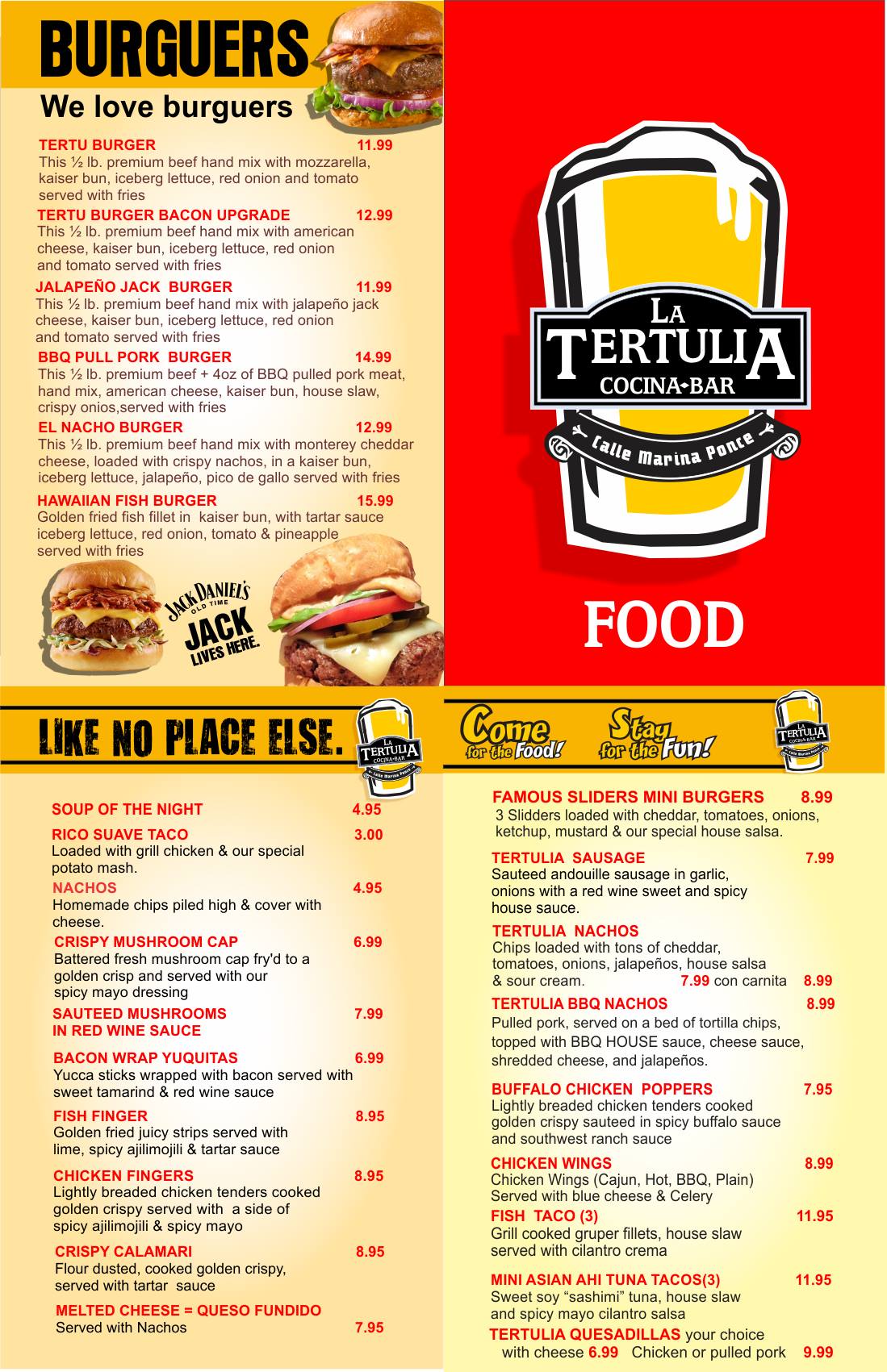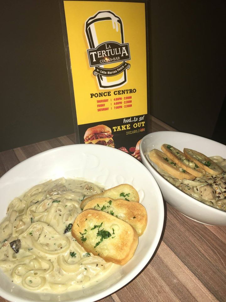 La Tertulia trajo comida de bar al siguiente nivel con la ayuda del Chef, Rene Santiago y su hijo René Gabriel Santiago Vallellanes. Especializado en artículos que satisfarán sus antojos, hamburguesas de Slider de la firma y nachos con rocas carnitas nuestro menú.