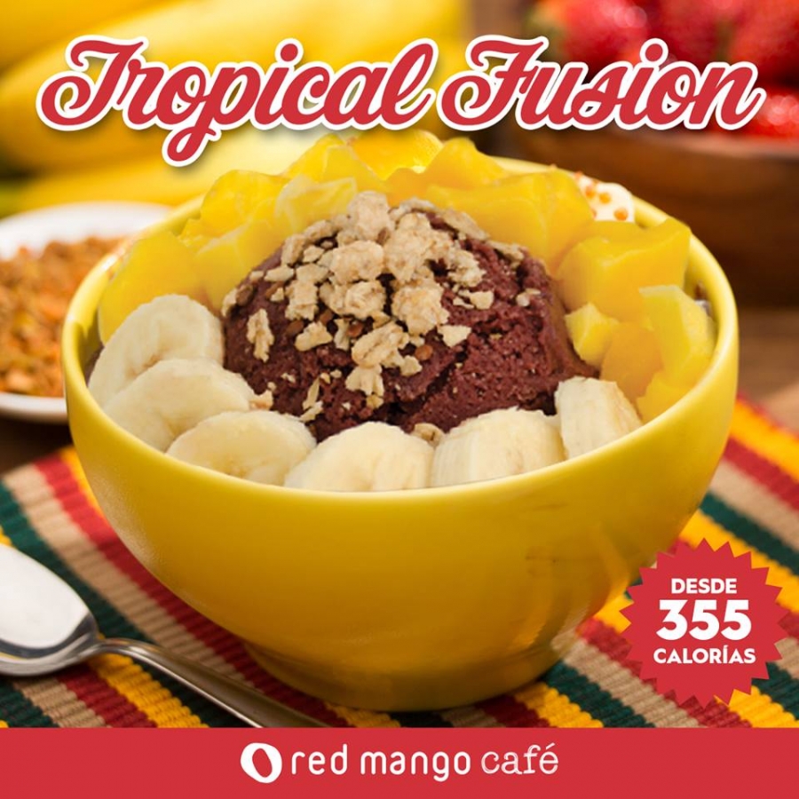Tropical Fusion: Acai, Granola, Guineo, Mango ó Piña, Aceite de Coco. Small $6.00 / Regular $8.00 Cal. (355/475)